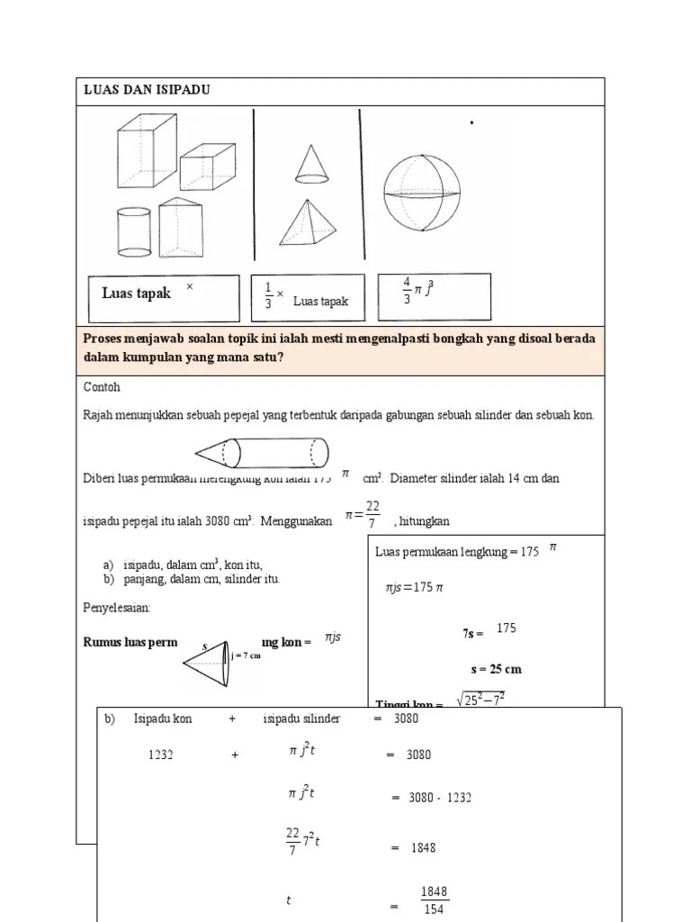 Silinder (prisma bulat):, Ï€ j 2 ⋅ t {\displaystyle \pi j^{2}\cdot t}. Model rumah tersebut dipanggil sebagai pepejal gubahan yang mana ianya terhasil daripada gabungan ? Play this game to review geometry. Permukaan bulatan dikalikan dengan tinggi silinder.